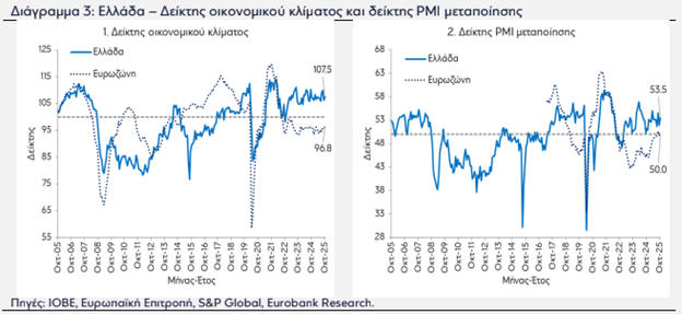 Eurobank τονίζει ότι οι δείκτες οικονομικού κλίματος και PMI