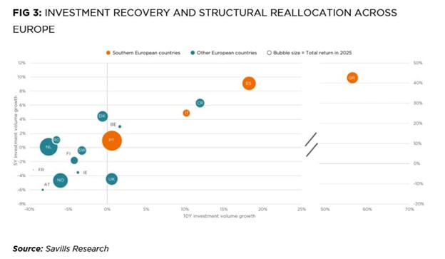 Συνολικά, η Savills καταλήγει ότι η Νότια Ευρώπη –και ιδιαίτερα η Ελλάδα– θα συνεχίσει να υπεραποδίδει σε σχέση με τον ευρωπαϊκό μέσο όρο, ακόμη και αν η αγορά εισέρχεται σε φάση πιο ώριμης και σταθεροποιημένης ανάπτυξης.
