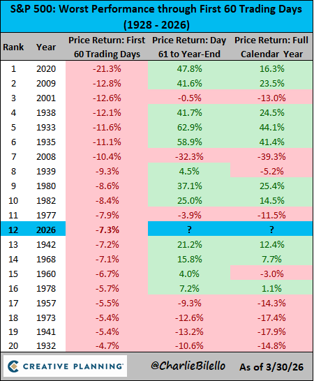 first 60 trading days of 2026, the 12th worst start to a