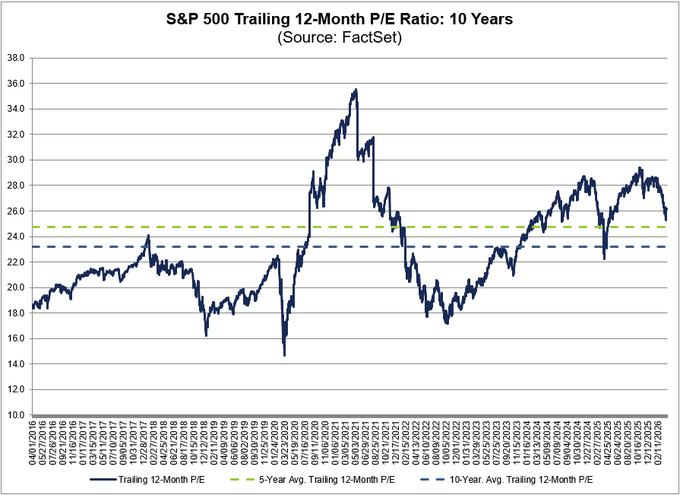 The trailing 12-month P/E ratio for SPX of 26.2 is above the 5-year average (24.7) and above the 10-year average (23.2)