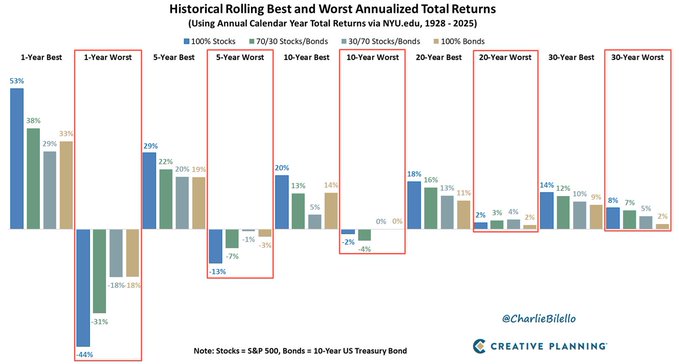The biggest risk in investing isn’t volatility. It’s a short time horizon. Worst S&P 500 annualized returns since 1928: 1 year: -44% 5 years: -13% 10 years: -2% 20 years: +2% 30 years: +8% The longer you stay invested, the smaller the risk of a bad outcome