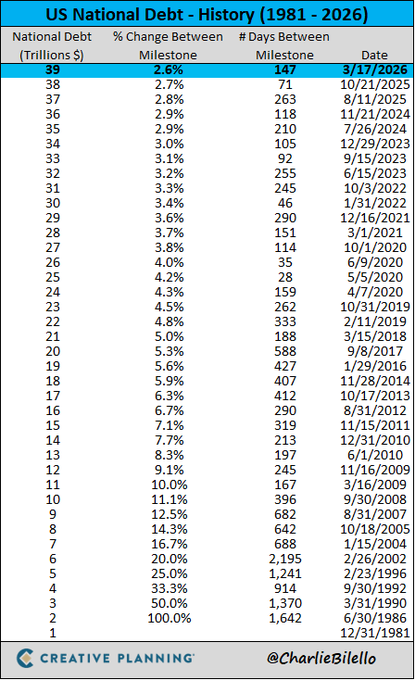 The US National Debt just crossed above $39 trillion for the first time, more than doubling over the last 10 years