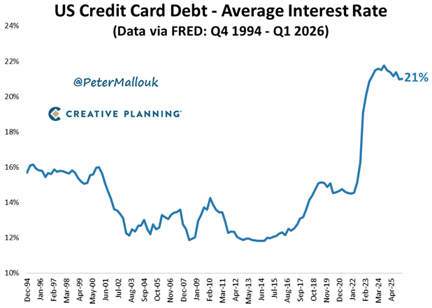 There is now a record $1.3 trillion in total credit card debt in the US - at an average interest rate of 21%. This is the #1 wealth killer in America by a landslide
