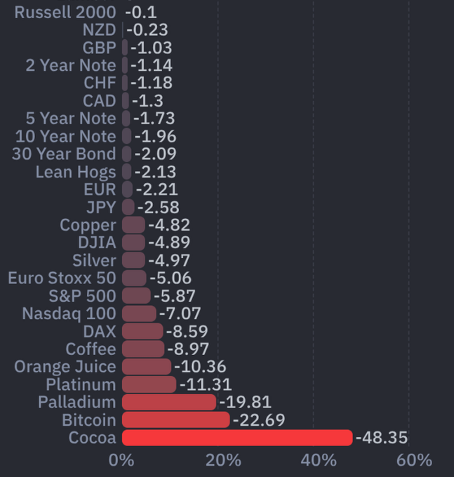 It's been a brutal year for cocoa, bitcoin, palladium, platinum and orange juice so far
